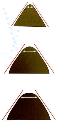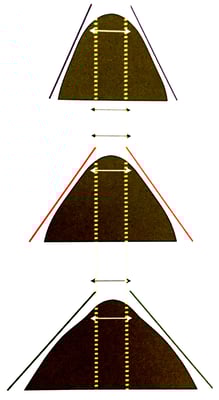 Die drei Zeichnungen auf der linken Seite, zeigen verschiedene Baumbreiten (Gulletweite), aber mit der gleichen Winkelung der